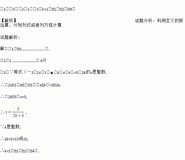 (1)-5;(2)1;(3)k=1,﹣1,﹣2,﹣4. 【解析】试题分析:利用定义的新运算,分别列式或者列方程计算. 试题解析: 解:(1)﹣5…………………….. (2)1 ……………………..4分 (3)∵等式(-3,2x-1)★(k,x+k)=5+2k的x是整数, ∴(2x﹣1)k﹣(﹣3)(x﹢k)=5﹢2k, ∴(2k﹢3)x=5, ∴, ...