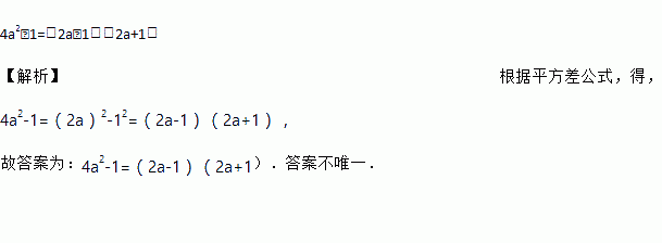 4a2﹣1=(2a﹣1)(2a+1) 【解析】根据平方差公式,得, 4a2-1=(2a)2-12=(2a-1)(2a+1), 故答案为:4a2-1=(2a-1)(2a+1).答案不唯一.