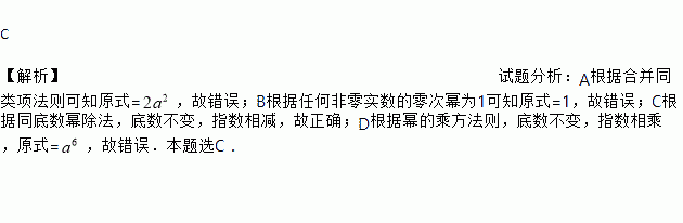 A. a 2 +a 2 =a 4 B. 30 =3 C. x 6 ÷x 2 =x 4 D. (a 3 ) 2 =a 5