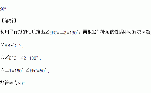 如图,平行线AB、CD被直线EF所截,若∠2=130°,则∠1=_____.