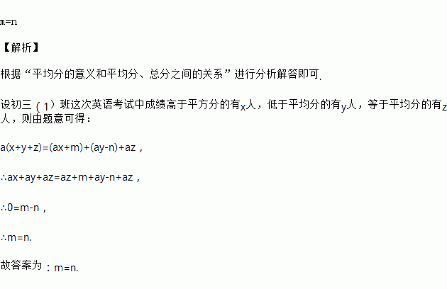 在一次测验中,初三(1)班的英语考试的平均分记为a分,所有高于平均分的学生的成绩减去平均分的分数之和记为m,所有低于平均分的学生的成绩与平均分相差的分数的绝对值的和记为n,则m与n的大小关系是 ______ .