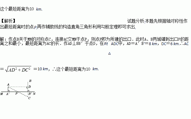 高速公路的同一侧有A、B两城镇,如图,它们到高速公路所在直线MN的距离分别为AA′=2 km,BB′=4 km,A′B′=8 km.要在高速公路上A′、B′之间建一个出口P,使A、B两城镇到P的距离之和最小.求这个最短距离.