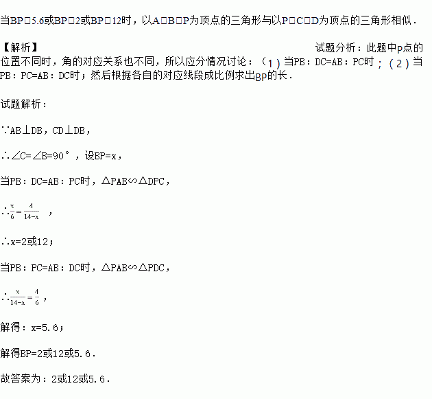 如图,已知AB⊥BC于点B,CD⊥BC于点C,AB=4,CD=6,BC=14,P为BC边上一点,试问BP为何值时,以A,B,P为顶点的三角形与以P,C,D为顶点的三角形相似?