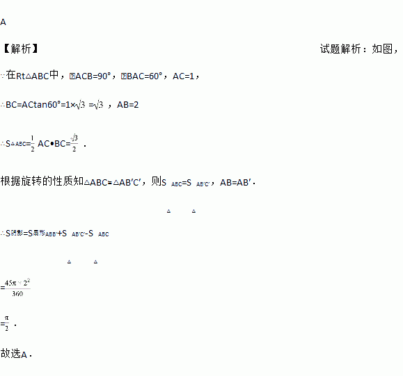 如图,将含60°角的直角三角板ABC绕顶点A顺时针旋转45°度后得到△AB′C′,点B经过的路径为弧BB′,若∠BAC=60°,AC=1,则图中阴影部分的面积是( )