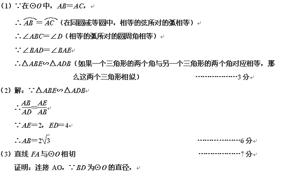 (11·西宁)(本小题满分10分)已知:如图,BD为⊙O的直径,AB=AC,AD交BC与E,AE=2,ED=4.