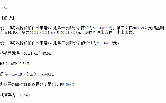 某药品经两次降价后,从原来每箱元降为每箱元,则平均每次的降价率为________.