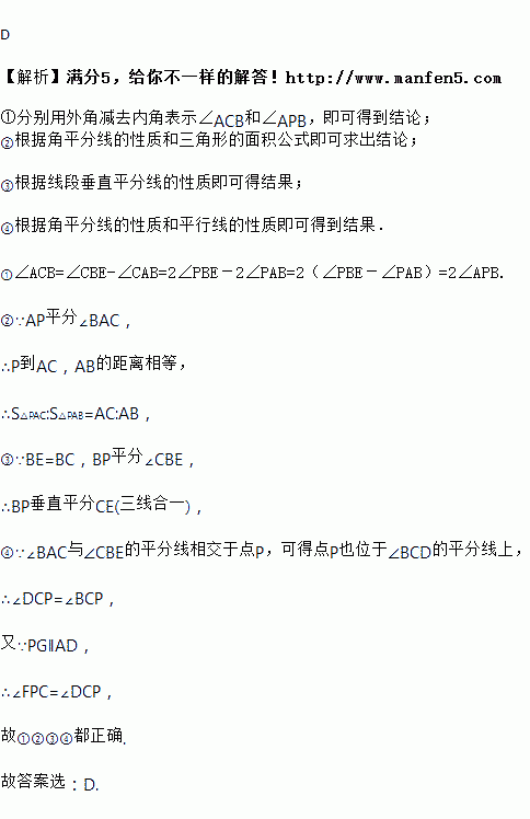 如图所示.在△ABC中,内角∠BAC与外角∠CBE的平分线相交于点P,BE=BC,PB与CE交于点H,PG∥AD交BC于F,交AB于G,连接CP.下列结论:①∠ACB=2∠APB;②S△PAC:S△PAB=AC:AB;③BP垂直平分CE;④∠PCF=∠CPF.其中,正确的有( )