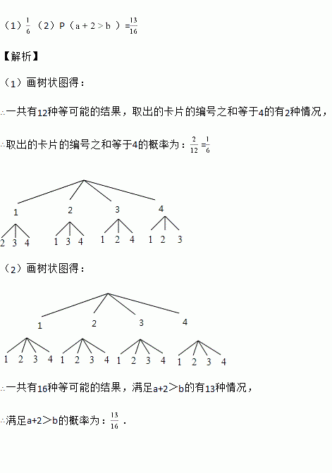 (1)从袋子中随机取两张卡片.求取出的卡片编号之和等于4的概率: