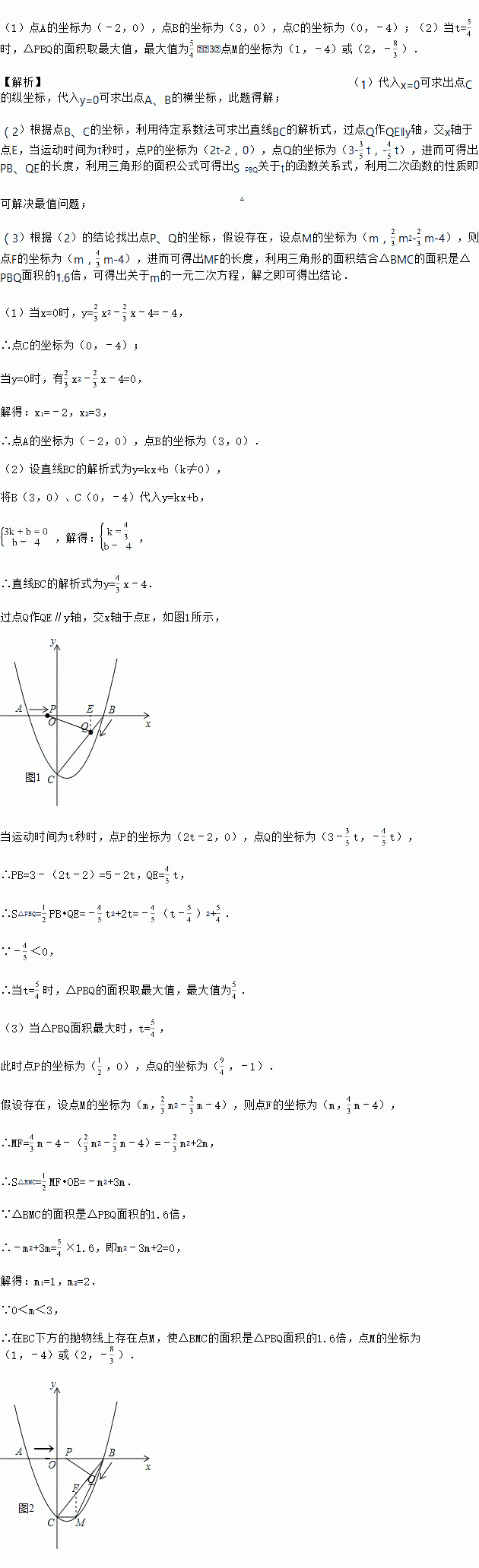 (3)在(2)的条件下,当△PBQ面积最大时,在BC下方的抛物线上是否存在点M,使△BMC的面积是△PBQ面积的1.6倍?若存在,求点M的坐标;若不存在,请说明理由.