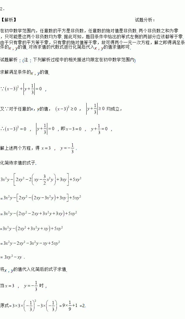 化简求值:已知:(x﹣3)2+|y+|=0,求3x2y﹣[2xy2﹣2(xy )+3xy]+5xy2的值.