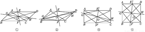 在?ABCD中,AC、BD交于点O,过点O作直线EF、GH,分别交平行四边形的四条边于E、G、F、H四点,连接EG、GF、FH、HE.