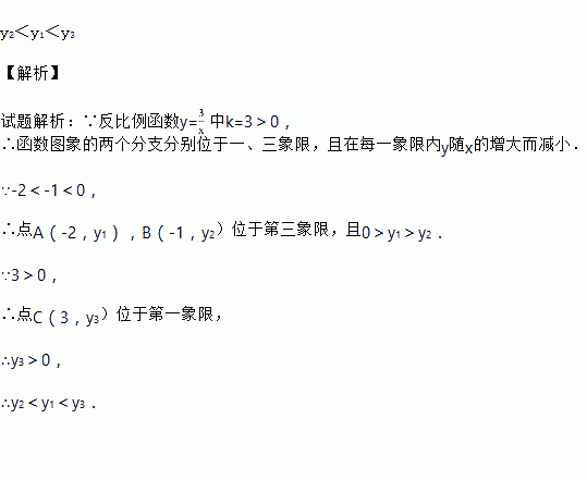 已知点A(﹣2,y1),B(﹣1,y2)和C(3,y3)都在反比例函数y=的图象上,则y1,y2,y3的大小关系为_____.(用“<”连接)