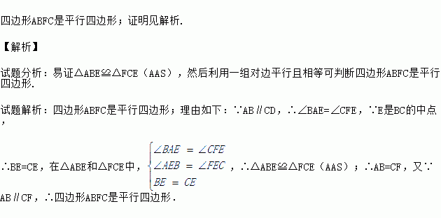 已知:如图,在四边形ABCD中,AB∥CD,E是BC的中点,直线AE交DC的延长线于点F.试判断四边形ABFC的形状,并证明你的结论.