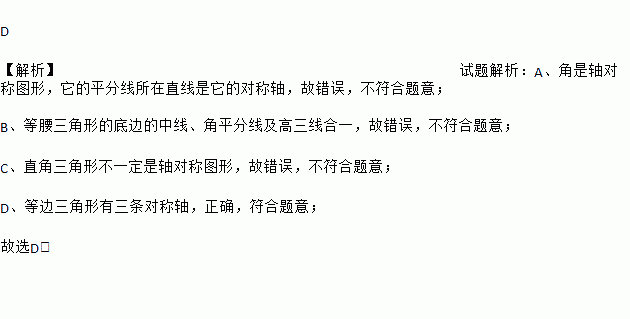 D 【解析】试题解析:A、角是轴对称图形,它的平分线所在直线是它的对称轴,故错误,不符合题意; B、等腰三角形的底边的中线、角平分线及高三线合一,故错误,不符合题意; C、直角三角形不一定是轴对称图形,故错误,不符合题意; D、等边三角形有三条对称轴,正确,符合题意; 故选D.