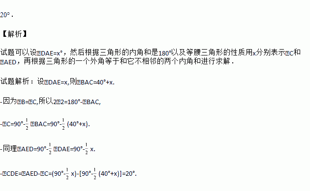 如图所示,在△ABC中,∠B=∠C,∠BAD=40°,并且∠ADE=∠AED,求∠CDE的度数.
