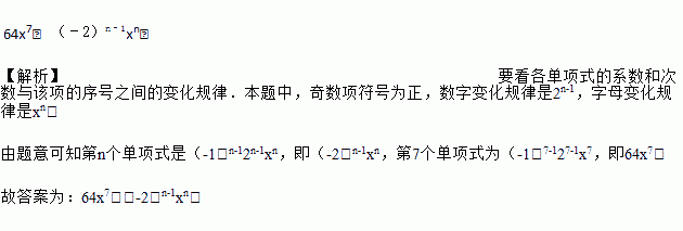 观察下面的一列单项式:x,﹣2x2,4x3,﹣8x4,…根据你发现的规律,第7个单项式为_____;第n个单项式为_____.