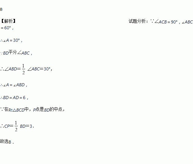 如图,在△ABC中,∠ACB=90°, ∠ABC=60°, BD平分∠ABC ,P点是BD的中点,若AD=6, 则CP的长为( )