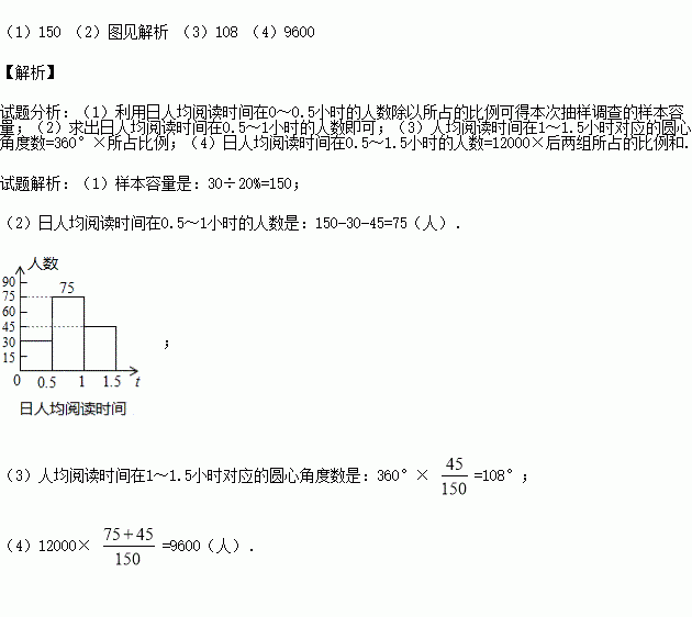 (4)根据本次抽样调查,试估计该市12000名初二学生中日人均阅读时间在0.5~1.5小时的多少人.