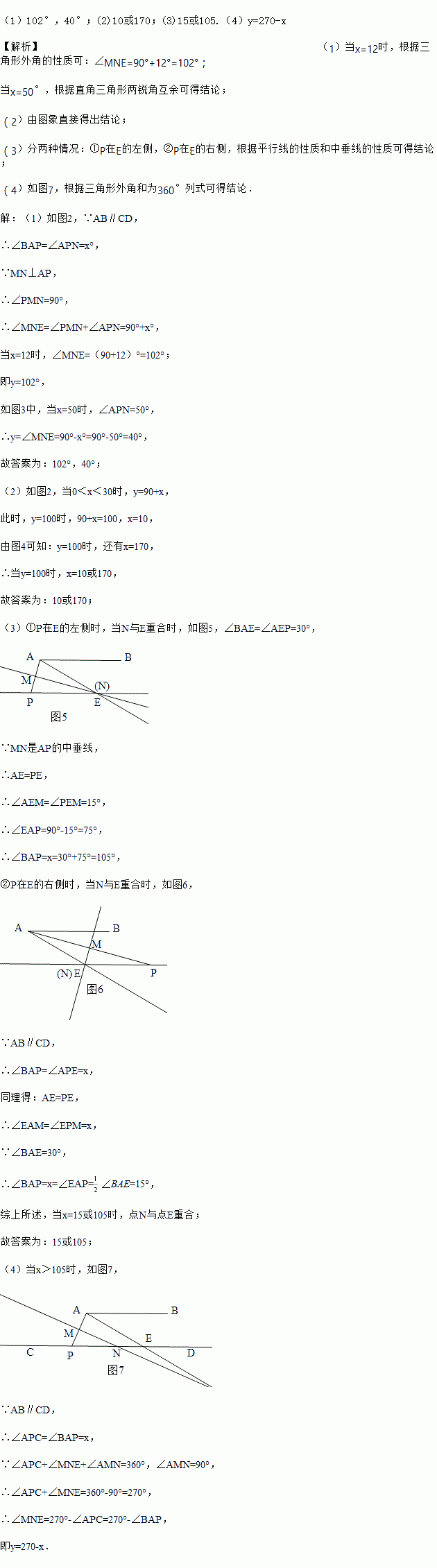 如图,AB∥CD,E 是直线 CD 上的一点,且 ∠BAE=30°, 是直线 CD 上的一动点,M是 AP 的中点,直线 MN⊥AP 且与 CD 交于点 N,设 ∠BAP=X°,∠MNE=Y°.