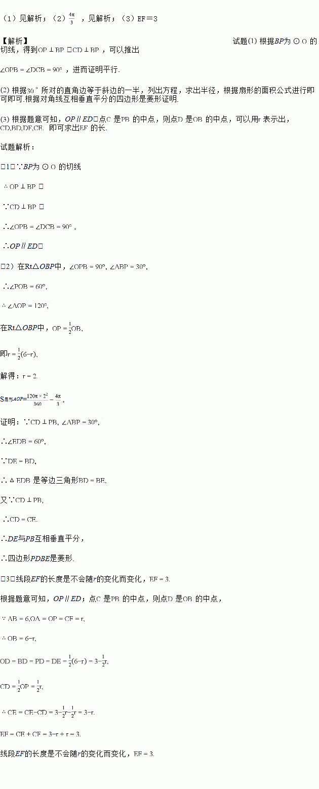 如图,点O在线段AB上,(不与端点A、B重合),以点O为圆心,OA的长为半径画弧,线段BP与这条弧相切与点P,直线CD垂直平分PB,交PB于点C,交AB于点D,在射线DC上截取DE,使DE=DB。已知AB=6,设OA=r。