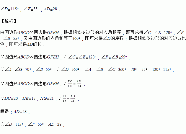 如图,四边形ABCD∽四边形GFEH,且∠A=∠G=70°,∠B=55°,∠E=120°,DC=20,HE=15,HG=21.求∠D,∠F的大小和AD的长.