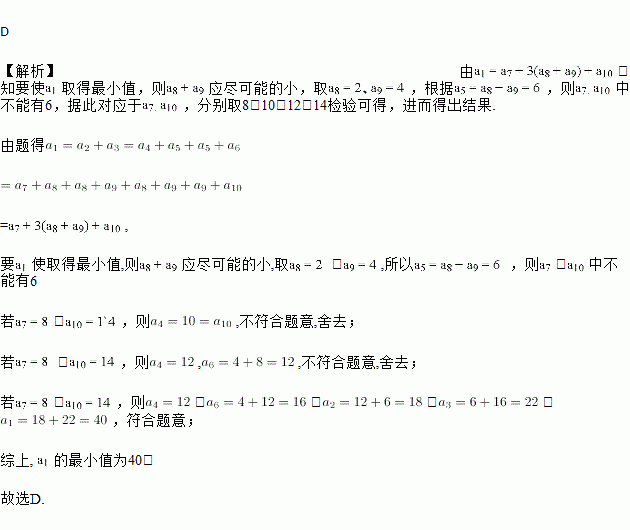 如图,10个不同正整数按下图排列,箭头上方的每个数都等于其下方两数的和.如表示a1=a2+a3,则a1的最小值为( )