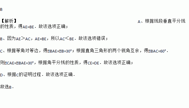 B 【解析】A、根据线段垂直平分线的性质,得AE=BE.故该选项正确; B、因为AE>AC,AE=BE,所以AC<BE.故该选项错误; C、根据等角对等边,得∠BAE=∠B=30°;根据直角三角形的两个锐角互余,得∠BAC=60°. 则∠CAE=∠BAE=30°,根据角平分线的性质,得CE=DE.故该选项正确; D、根据C的证明过程.故该选项正确. 故选B. ...