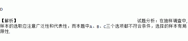 D 【解析】试题分析:在抽样调查中,样本的选取应注意广泛性和代表性,而本题中A、B、C三个选项都不符合条件,选择的样本有局限性.