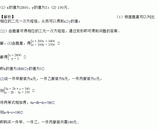 (2)商场为了多销售服装,对顾客推荐一种购买方式:如果购买甲服装3件,乙服装2件,丙服袋1件共需390元:如果购买甲服装1件,乙服装2件,丙服装3件共需370元.某顾客想购买甲、乙、丙服装各一件共需多少元?