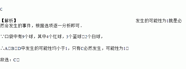 口袋中有9个球,其中4个红球,3个蓝球,2个白球,在下列事件中,发生的可能性为1的是( )