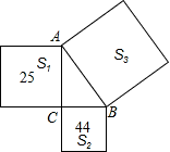 如图,Rt△ABC中,∠C=90°,三个正方形中的两个面积分别为25和44,则第三个正方形的面积为