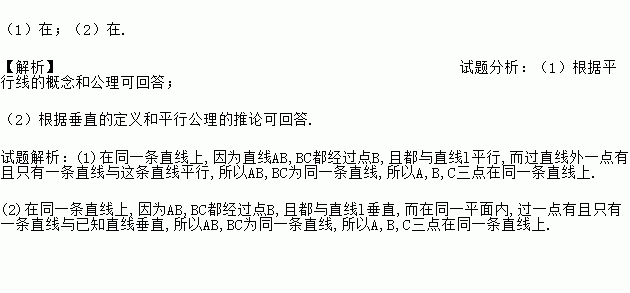 (1)在;(2)在. 【解析】试题分析:(1)根据平行线的概念和公理可回答; (2)根据垂直的定义和平行公理的推论可回答. 试题解析:(1)在同一条直线上,因为直线AB,BC都经过点B,且都与直线l平行,而过直线外一点有且只有一条直线与这条直线平行,所以AB,BC为同一条直线,所以A,B,C三点在同一条直线上. (2)在同一条直线上,因为AB,BC都经过点B,且都与直线l垂...