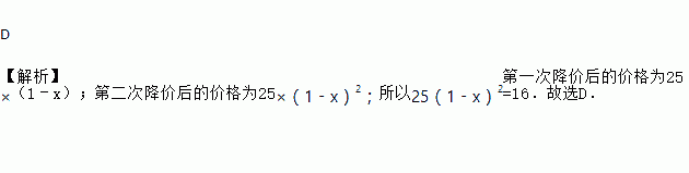 一种药品原价每盒25元,经过两次降价后每盒16元,两次降价的百分率相同,设每次降价的百分率为x,则符合题意的方程为( )