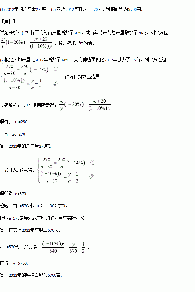 (2)该农场2012年有职工a人。2013年时,由于多种原因较少了30人,故这种特产的人均产量比2012年增加了14%,而人均种植面积比2012年减少了0.5亩。求2012年的职工人数a与种植面积y。