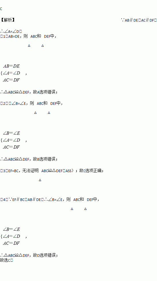 如图,AB∥DE,AC∥DF,AC=DF,下列条件不能判断△ABC≌△DEF的是( )