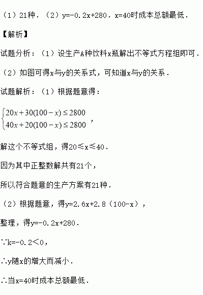 (1)21种.(2)y=-0.2x+280.x=40时成本总额最低. 【解析】 试题分析:(1)设生产A种饮料x瓶解出不等式方程组即可. (2)如图可得x与y的关系式,可知道x与y的关系. 试题解析:(1)根据题意得: , 解这个不等式组,得20≤x≤40. 因为其中正整数解共有21个, 所以符合题意的生产方案有21种. (2)根据题意,得y=...