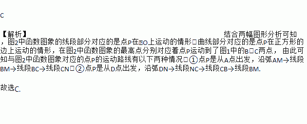 C 【解析】结合两幅图形分析可知,图2中函数图象的线段部分对应的是点P在⊙O上运动的情形,曲线部分对应的是点P在正方形的边上运动的情形,在图2中函数图象的最高点分别对应着点P运动到了图1中的B、C两点, 由此可知与图2中函数图象对应的点P的运动路线有以下两种情况:①点P是从A点出发,沿弧AM→线段BM→线段BC→线段CN:②点P是从D点出发,沿弧DN→线段NC→线段CB→线段BM. 故...