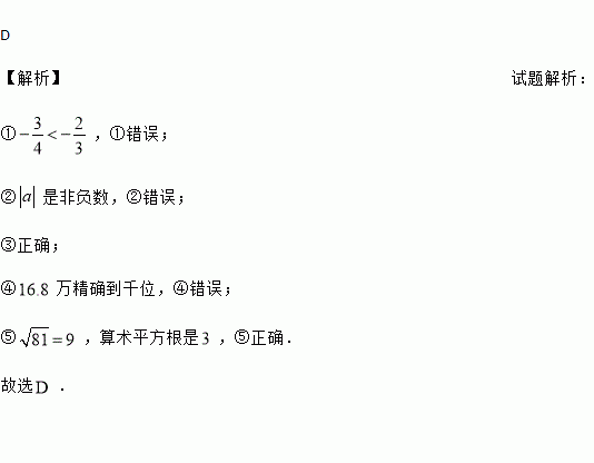 D 【解析】试题解析: ①,①错误; ②是非负数,②错误; ③正确; ④万精确到千位,④错误; ⑤,算术平方根是,⑤正确. 故选.