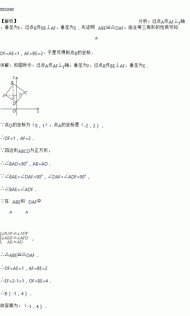 如图,在正方形ABCD中,点D的坐标为(0,1),点A的坐标是(﹣2,2),则点B的坐标为________.