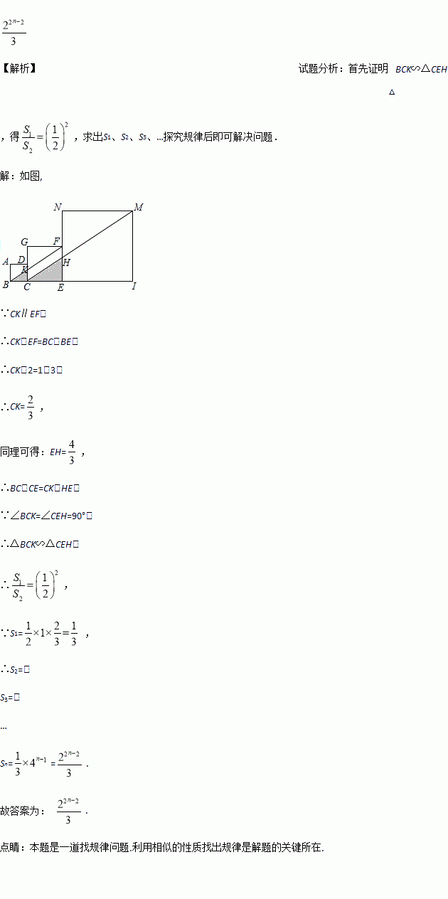 正方形ABCD的边长为1,正方形CEFG边长为2,正方形EIMN边长为4,以后的正方形边长按此规律扩大,其中点B、C、E、I…在同一条直线上,连接BF交CG于点K,连接CM交EN于点H,记△BCK的面积为S1,△CEH的面积为S2,…,依此规律,Sn=__.