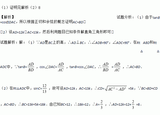 如图,在△ABC中,AD是BC上的高,tanB=cos∠DAC.