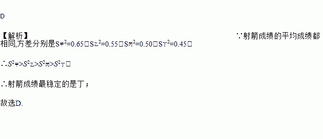 甲、乙、丙、丁四人进行射箭测试,每人10次射箭成绩的平均成绩都相同,方差分别是S甲2=0.65,S乙2=0.55,S丙2=0.50,S丁2=0.45,则射箭成绩最稳定的是( )