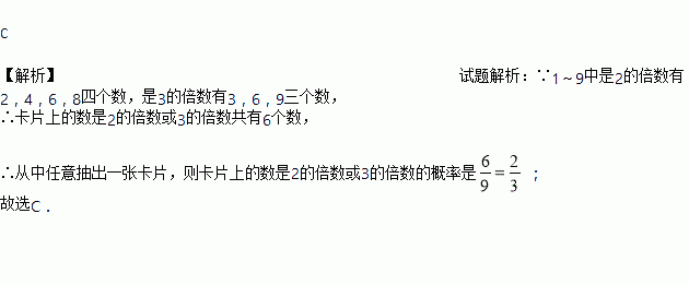 把1到9的自然数依次写在9张形状相同的卡片上,打乱次序放入袋中.从中任意抽出一张卡片,则卡片上的数是2的倍数或3的倍数的概率是( )