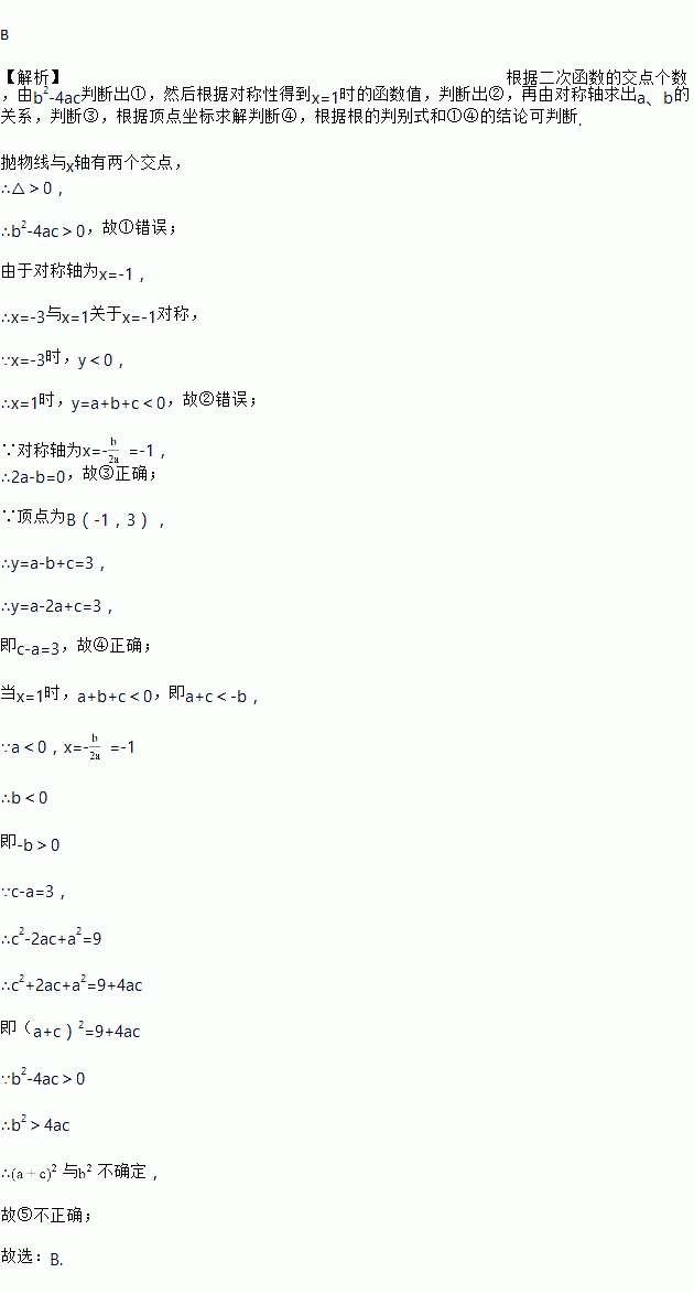 如图,抛物线的顶点为B(-1,3),与轴的交点A在点(-3,0)和(-2,0)之间,以下结论:①;②;③;④; ⑤其中正确的有( )