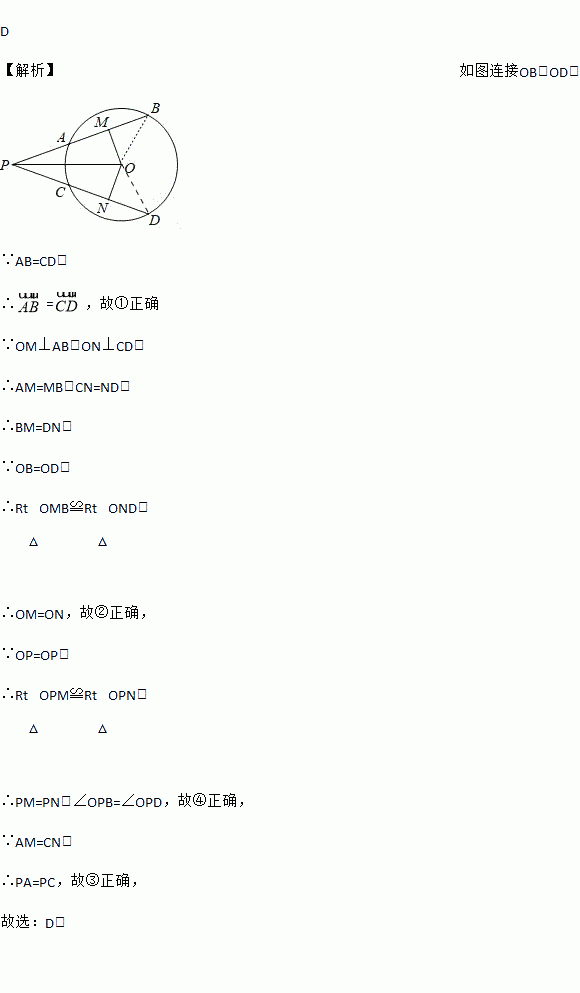 如图,已知AB和CD是⊙O的两条等弦.OM⊥AB,ON⊥CD,垂足分别为点M、N,BA、DC的延长线交于点P,联结OP.下列四个说法中:①弧AB=弧CD;②OM=ON;③PA=PC;④∠BPO=∠DPO,正确的个数是( )