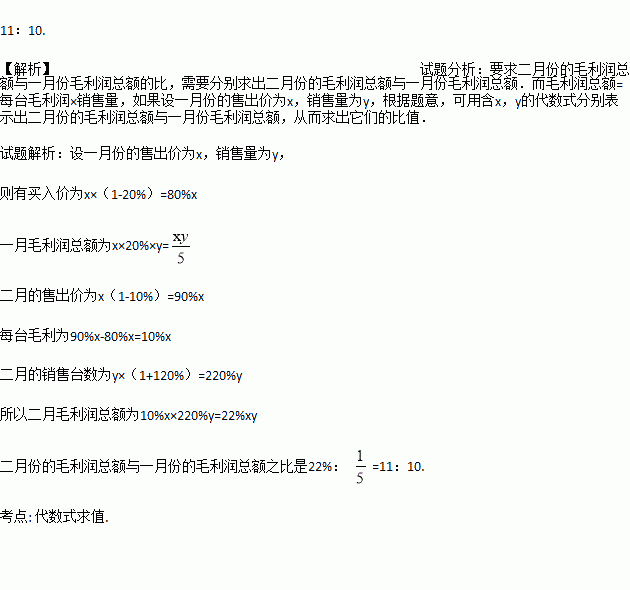 某商场销售一批电视机,一月份每台毛利润是售出价的20%(毛利润=售出价-买入价),二月份该商场将每台售出价调低10%(买入价不变),结果销售台数比一月份增加120%,那么二月份的毛利润总额与一月份毛利润总额的比是__________。