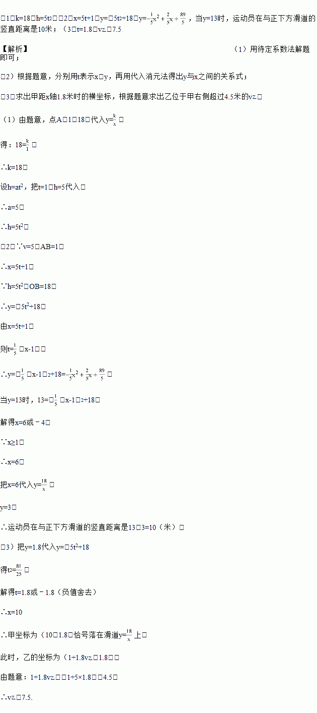 £¨x¡Ý1£©½»ÓÚµãA£¬ÇÒAB=1Ã×£®Ô˶¯Ô±£¨¿´³Éµã£©ÔÚBA·½Ïò»ñµÃËÙ¶ÈvÃ×/Ãëºó£¬´ÓA´¦ÏòÓÒÏ·ÉÏò»¬µÀ£¬µãMÊÇÏÂÂä·ÏßµÄijλÖ㮺öÂÔ¿ÕÆø×èÁ¦£¬ÊµÑé±íÃ÷£ºM£¬AµÄÊúÖ±¾àÀëh£¨Ã×£©Óë·É³öʱ¼ät£¨Ã룩µÄƽ·½³ÉÕý±È£¬ÇÒt=1ʱh=5£¬M£¬AµÄˮƽ¾àÀëÊÇvtÃ×£®