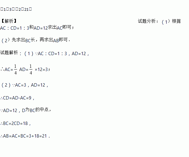 如图,点C、D是线段AB上两点,AC:CD=1:3,点D是线段CB的中点,AD=12.