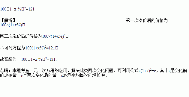 某商品原价100元,连续两次涨价x%后售价为121元,则列出的方程是_____