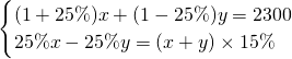 分析:设去年男生有x人,女生有y人.根据去年有学生2300人,得方程x+y=2300;根据今年比去年男生增加了25%x人,女生减少了25%y人,全校学生数共增加了(x+y)×15%人,得方程25%x-25%y=(x+y)×15%,继而求解即可.